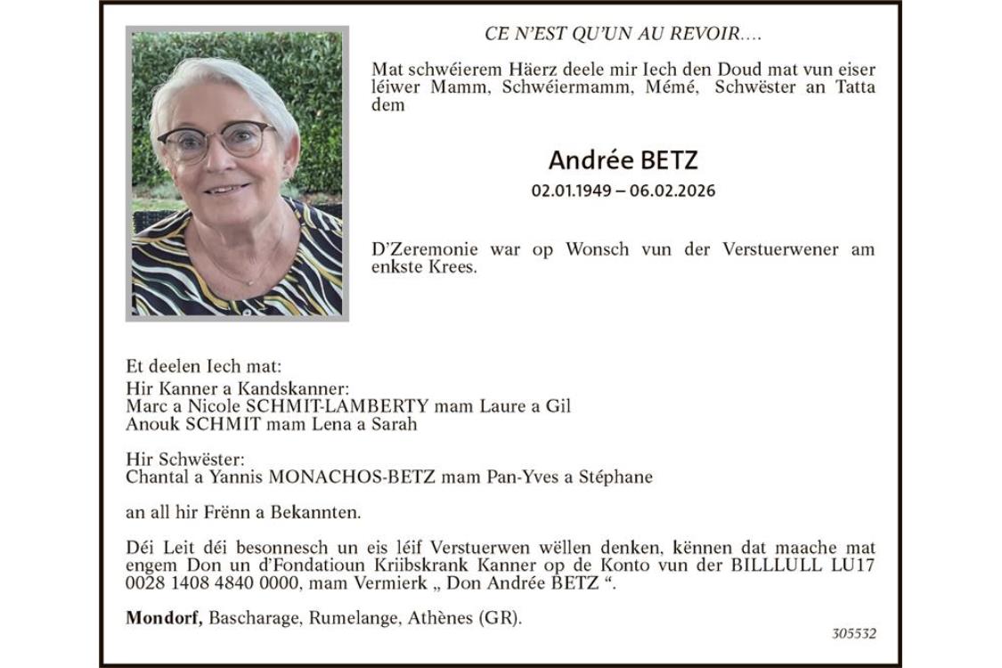 Avis mortuaire Madame Andrée Betz