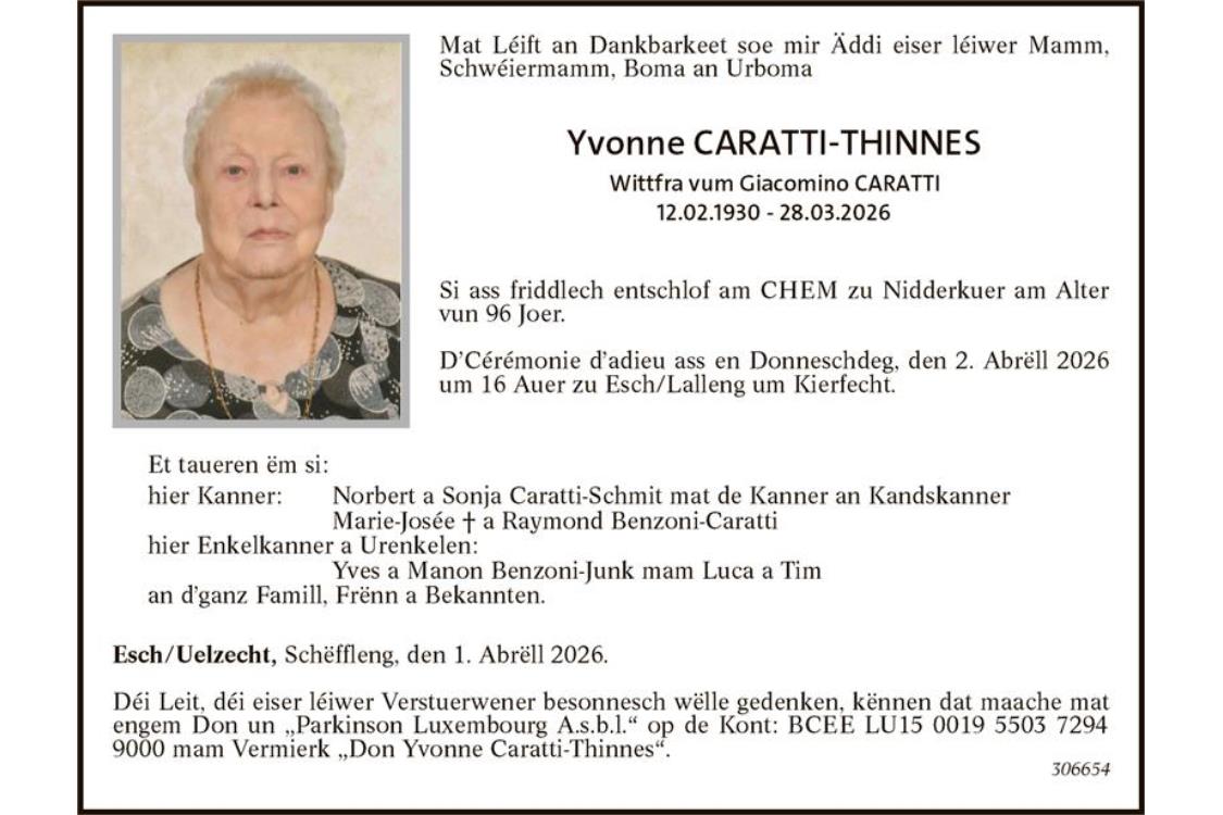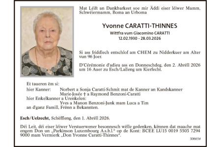 Avis mortuaire Madame Yvonne Caratti-Thinnes